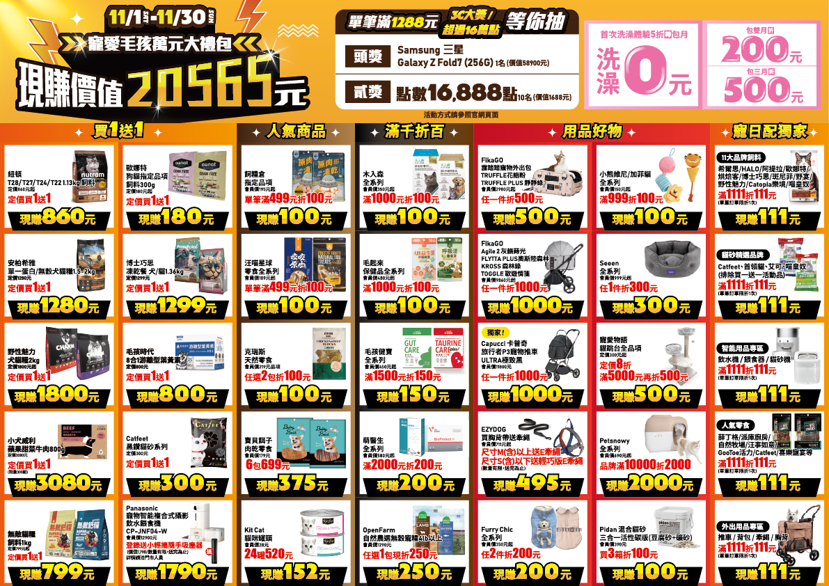 活動期間內於寵物公園全通路及貓狗隊長門市當日單筆消費金額滿$1288元即可參加抽獎活動乙次,每位會員每日僅可參加乙次抽獎活動,活動共抽出 Samsung Galaxy Z Fold7 256GB 共1名、16,888會員點數共10名。中獎名單將於 12/12 於寵物公園粉絲團公告。依中華民國稅法規定,在中華民國境內居住之個人領取本公司中獎獎項價值全年累計超過新台幣 1,000元(含) 以上時,必須申報綜合所得稅,中獎獎項價值全年累計超過新台幣 20,000元(含) 以上時,主辦單位將代扣10%所得稅,相關辦理及其他未盡事宜,悉依稅法相關規定辦理。本活動獎項限中獎會員本人領取,顏色隨機不可挑色不得要求更換、兌換或折抵現金。本注意事項若有未盡事宜,萬達寵物保留修改之權利,若有任何更動,皆以粉絲團公告為準,不另行通知。